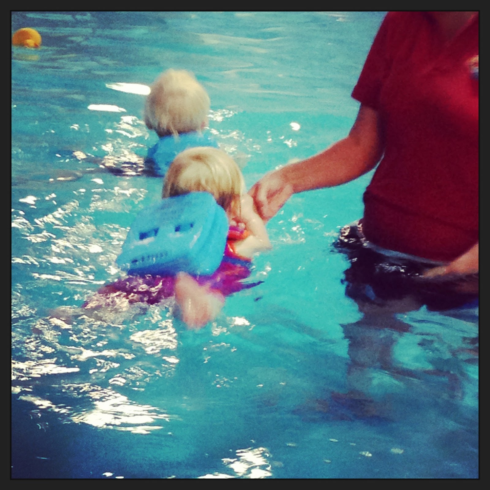 Eliza (2) has just started swimming lessons with just the teacher and also loves it.  In fact she screams when it is time to get out.  We are currently working on her kicks and paddles and she loves nothing more than chasing a rubber duck around the pool, or running across a mat that’s floating and hurling herself into the water.